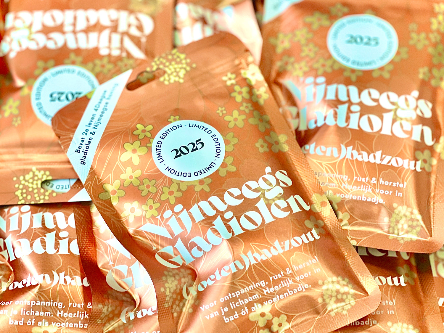 De Nijmeegse Wandel 4Daagse is het grootste wandelevent ter wereld! Wij ontwikkelden het Nijmeegs Gladiolen (Voeten)badzout met o.a. Dode zeezout, Epsomzout, lokale honing én 2e leven gladiolen als symbool van overwinning. Dit geschenk was tijdens de 4Daagse te koop bij 35+ verkooppartners in- en rondom Nijmegen. Dankzij het verkoopsucces van deze special hebben wij tevens een mooi bedrag kunnen doneren aan het Radboudumc Amalia Kinderfonds.